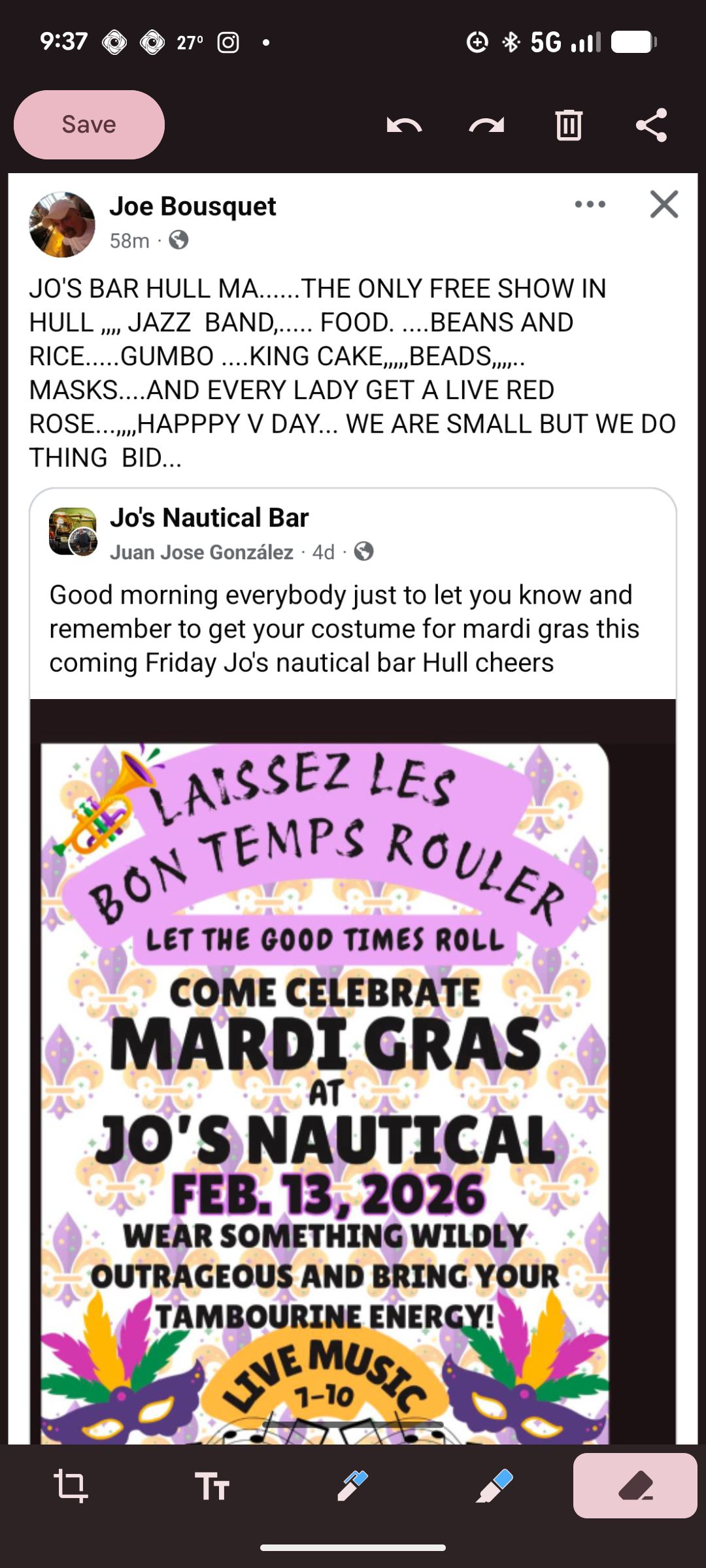 Don’t miss this incredible Mardi Gras party at Jo’s Nautical Bar Friday, Feb. 13 — summer’s coming!! 🎵🎸💃