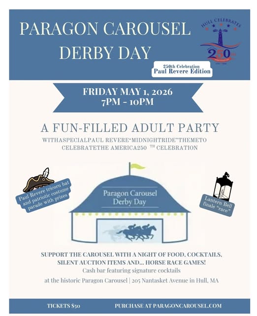 Paragon Carousel 205 Nantasket Avenue, Hull, MA, United StatesDon't Miss The Paragon Carousel Derby Day this Friday, May 1, 2026 from 7p-10p. It's a fun-filled adult party!! They will have a Cash Bar with Signature Cocktails